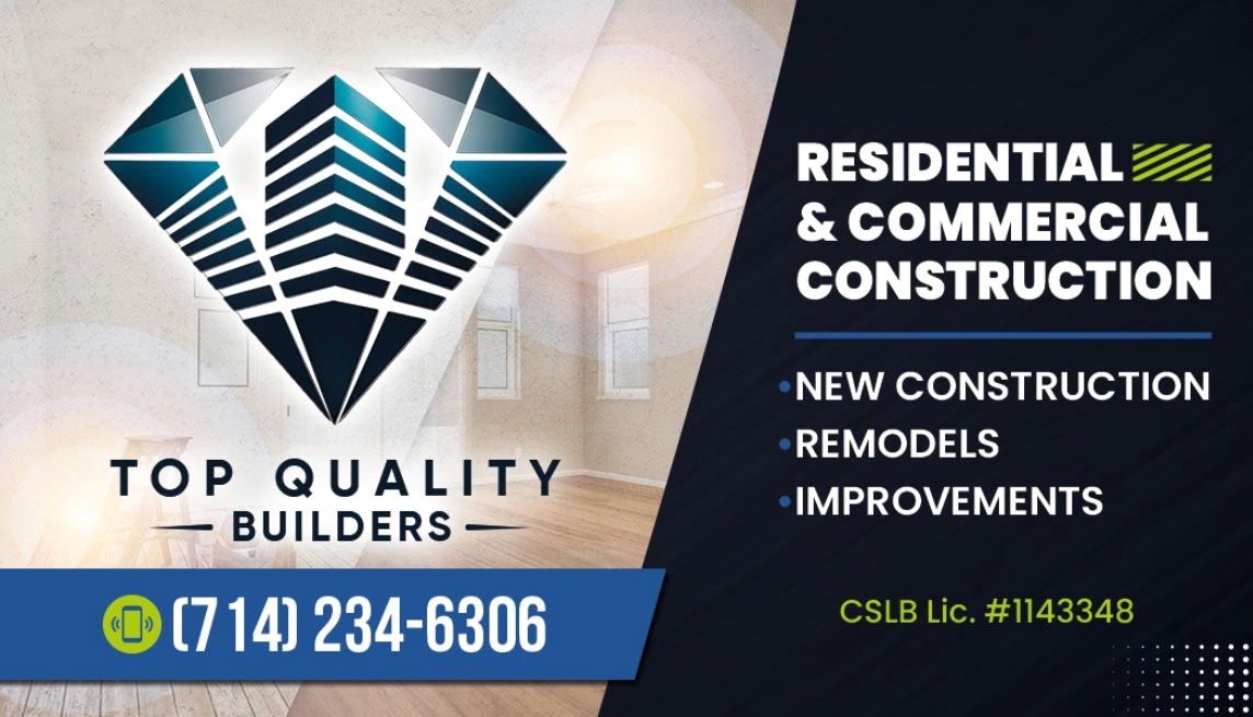 Top Quality Builders is a California-licensed and insured construction company providing reliable residential and commercial construction services. We specialize in new construction, remodeling, and project improvements, delivering quality workmanship with integrity, accountability, and clear communication.